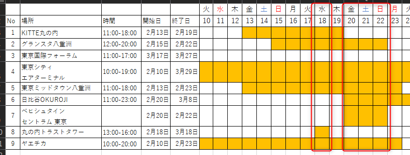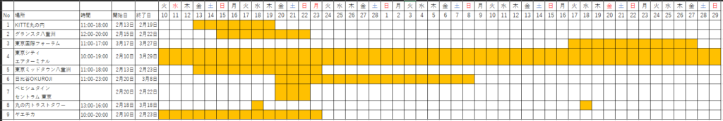 ですが、「2月のみのスポット」・「3月のみのスポット」・「2月~3月のスポット」と大きく3つに分かれています。